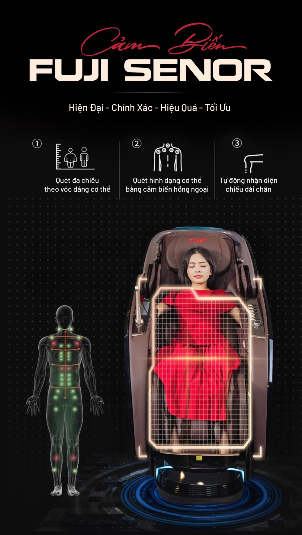 Công nghệ cảm biến Fuji Sensor là tính năng thông minh cho phép ghế massage tự động nhận diện và phân tích cấu trúc cơ thể người dùng chính xác. Ngay khi bạn ngồi vào, hệ thống cảm biến quang học hoặc áp lực tích hợp sẵn sẽ quét dữ liệu về chiều cao, đường cong cột sống, vị trí cơ bắp và huyệt đạo. Dữ liệu này được xử lý để tạo bản đồ cơ thể 3D cá nhân hóa, từ đó điều chỉnh vị trí, phạm vi di chuyển và lực tác động của con lăn, đảm bảo liệu trình massage phù hợp hoàn hảo với từng vóc dáng.
