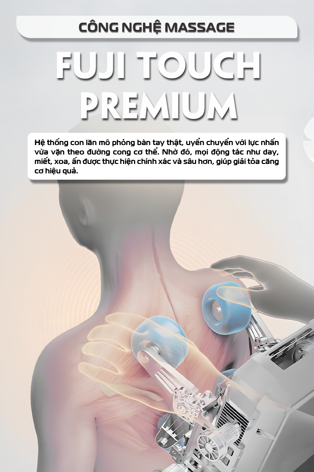 Hệ thống con lăn mô phỏng bàn tay thật, uyển chuyển với lực nhấn vừa vặn theo đường cong cơ thể. Nhờ đó, mọi động tác như day, miết, xoa, ấn được thực hiện chính xác và sâu hơn, giúp giải tỏa căng cơ hiệu quả.