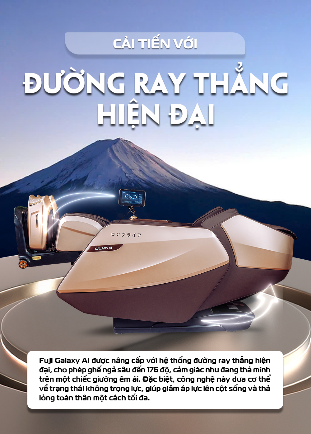Fuji Galaxy AI được nâng cấp với hệ thống đường ray thẳng hiện đại, cho phép ghế ngả sâu đến 176 độ, cảm giác như đang thả mình trên một chiếc giường êm ái. Đặc biệt, công nghệ này đưa cơ thể về trạng thái không trọng lực, giúp giảm áp lực lên cột sống và thả lỏng toàn thân một cách tối đa.