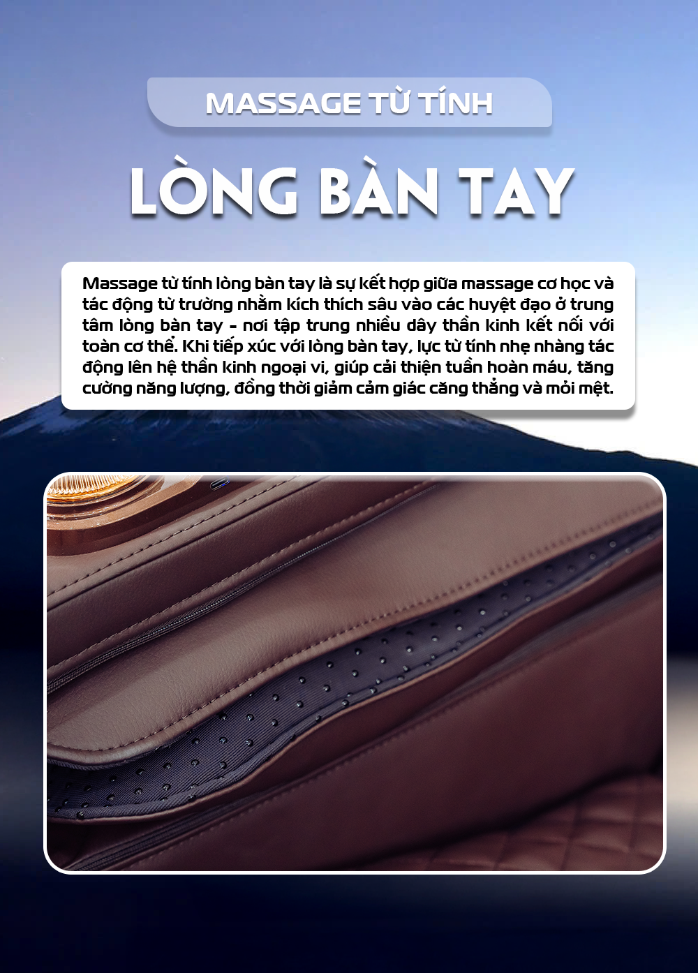 Massage từ tính lòng bàn tay là sự kết hợp giữa massage cơ học và tác động từ trường nhằm kích thích sâu vào các huyệt đạo ở trung tâm lòng bàn tay - nơi tập trung nhiều dây thần kinh kết nối với toàn cơ thể. Khi tiếp xúc với lòng bàn tay, lực từ tính nhẹ nhàng tác động lên hệ thần kinh ngoại vi, giúp cải thiện tuần hoàn máu, tăng cường năng lượng, đồng thời giảm cảm giác căng thẳng và mỏi mệt.