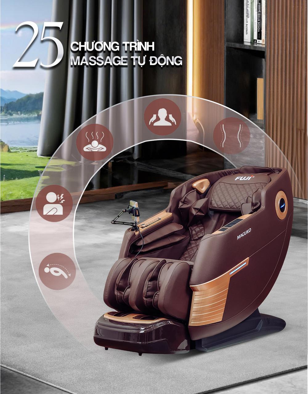 Ghế massage Fuji Maguko được tích hợp sẵn 25 bài massage tự động, từ thư giãn nhẹ nhàng đến chuyên sâu, đáp ứng mọi nhu cầu của người dùng. Mỗi bài massage là một trải nghiệm độc đáo, giúp bạn giải tỏa căng thẳng, phục hồi năng lượng sau ngày dài hoạt động.