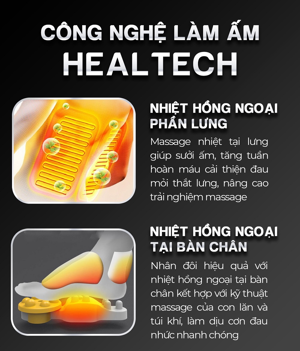 Công nghệ làm ấm độc quyền HealTech đưa hơi ấm lan tỏa khắp cơ thể, hòa quyện nhịp nhàng với các động tác massage chuyên sâu, mang đến cảm giác thư thái tuyệt vời. Chế độ này không chỉ giúp sưởi ấm cơ thể một cách dễ chịu mà còn hỗ trợ giảm đau nhức xương khớp, đặc biệt hữu ích cho người cao tuổi và những ai thường xuyên gặp phải tình trạng lạnh buốt chân tay,...