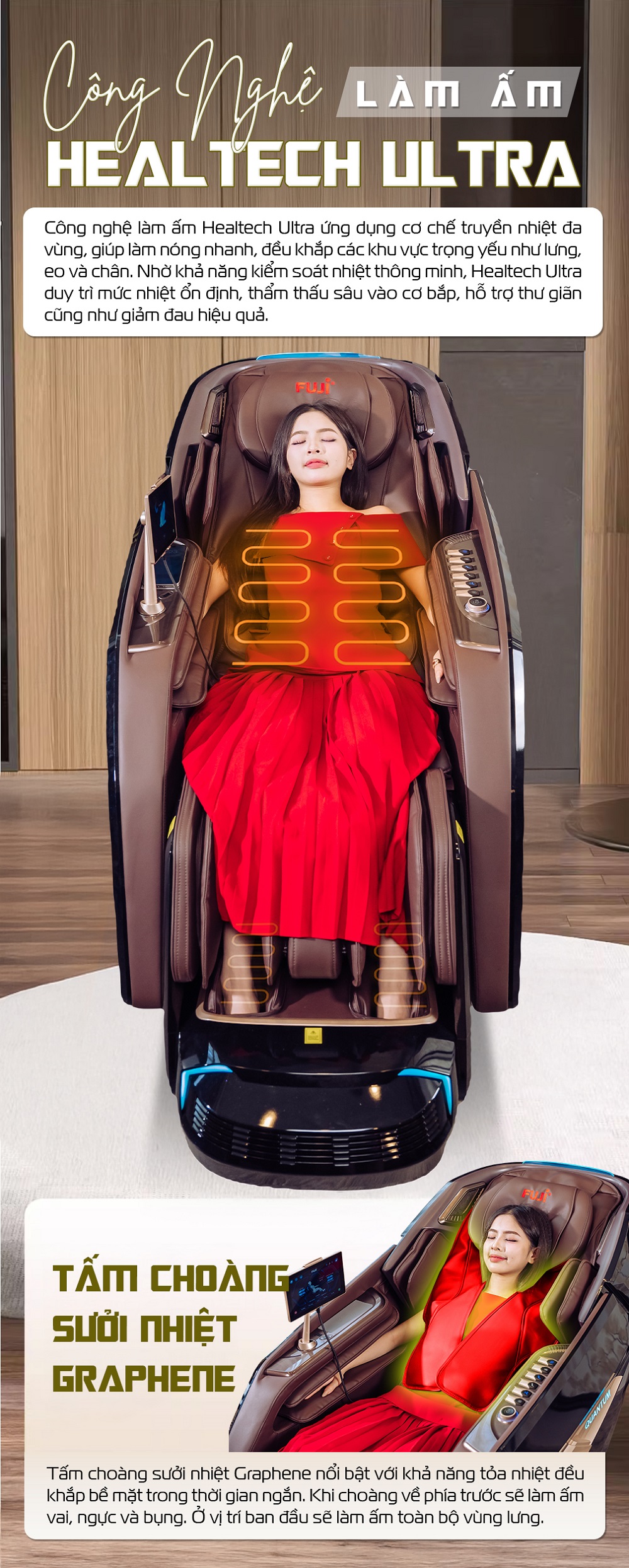 Công nghệ làm ấm Healtech Ultra ứng dụng cơ chế truyền nhiệt đa vùng, giúp làm nóng nhanh và đều khắp các khu vực trọng yếu như lưng, eo và chân. Nhờ khả năng kiểm soát nhiệt thông minh, Healtech Ultra duy trì mức nhiệt ổn định, thẩm thấu sâu vào cơ bắp, hỗ trợ thư giãn và giảm đau hiệu quả. Đặc biệt, tấm choàng sưởi nhiệt Graphene nổi bật với khả năng tỏa nhiệt đều khắp bề mặt trong thời gian ngắn. Khi choàng về phía trước sẽ làm ấm vai, ngực và bụng. Ở vị trí ban đầu sẽ làm ấm toàn bộ vùng lưng.
