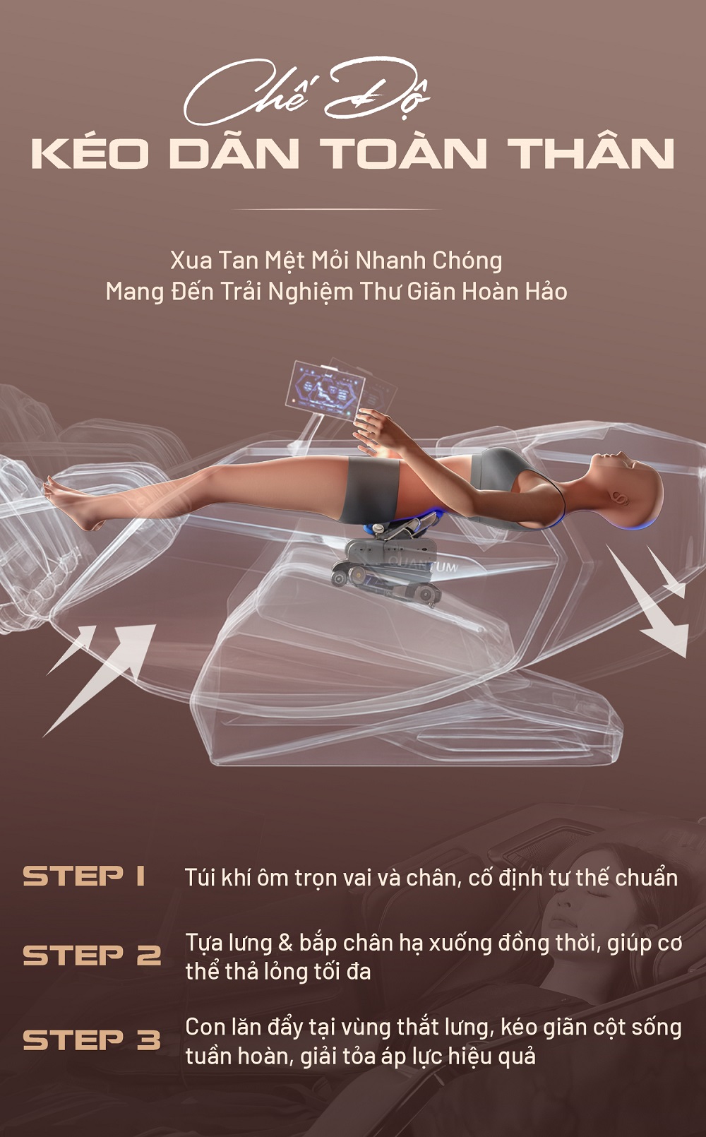 Mô phỏng kỹ thuật massage kiểu Thái, giúp kéo giãn toàn thân, giải phóng áp lực lên các đốt sống và khớp gối. Khi kích hoạt, ghế sẽ nhẹ nhàng kéo phần vai lên và phần chân xuống, tạo cảm giác giãn cơ dễ chịu như đang được trị liệu chuyên nghiệp. Đây là chương trình lý tưởng cho những ai thường xuyên ngồi lâu, đau mỏi lưng hoặc cần thư giãn sâu sau ngày dài căng thẳng.