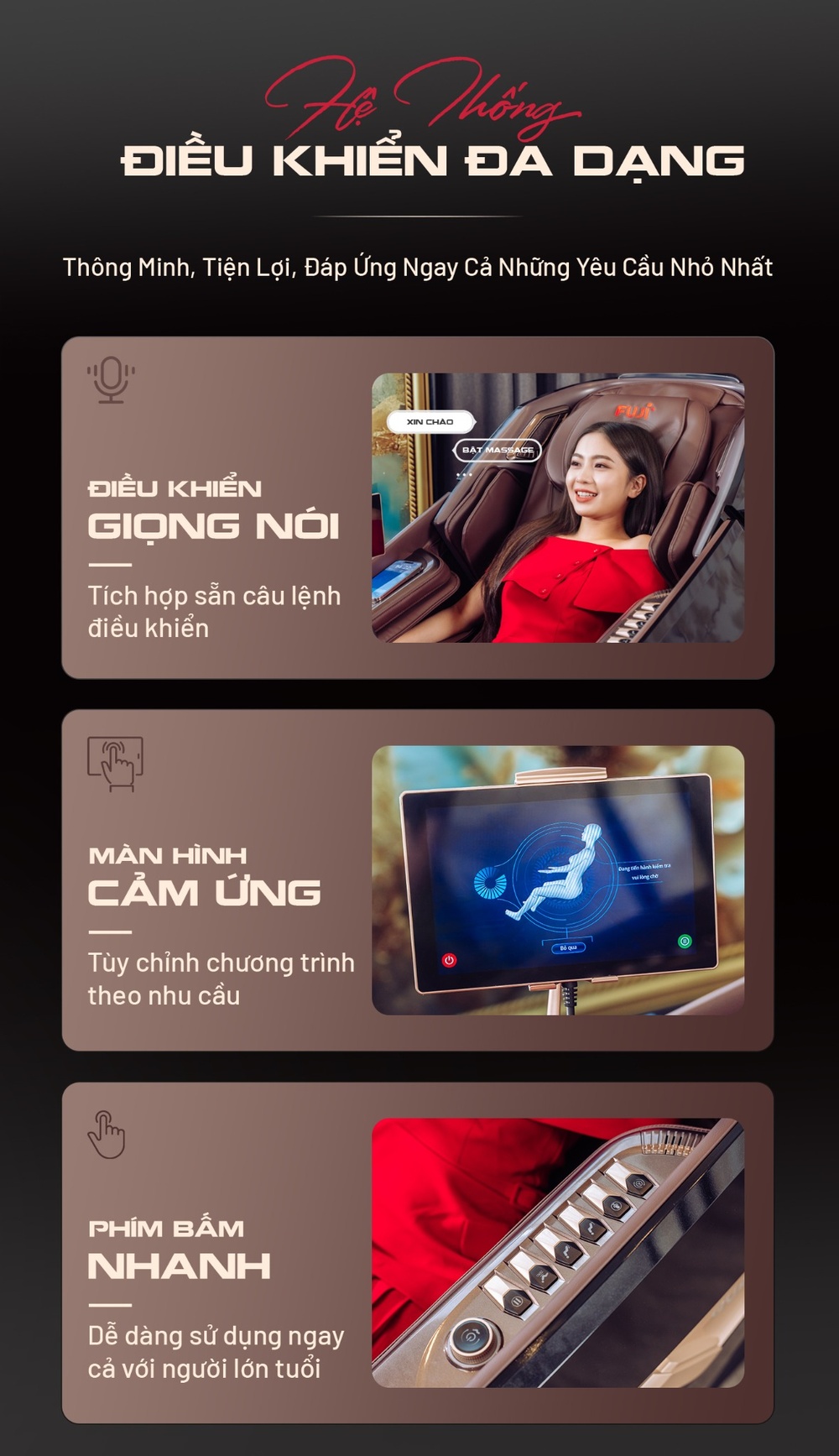 Ghế massage Fuji Quantum mang đến trải nghiệm tiện nghi vượt trội với 3 phương thức điều khiển thông minh: giọng nói, màn hình cảm ứng và phím bấm nhanh. Người dùng có thể dễ dàng tùy chỉnh chế độ massage chỉ bằng câu lệnh, chạm nhẹ trên màn hình hoặc sử dụng nút bấm trực quan. Thiết kế này giúp mọi thao tác trở nên đơn giản, thuận tiện, ngay cả với người lớn tuổi.