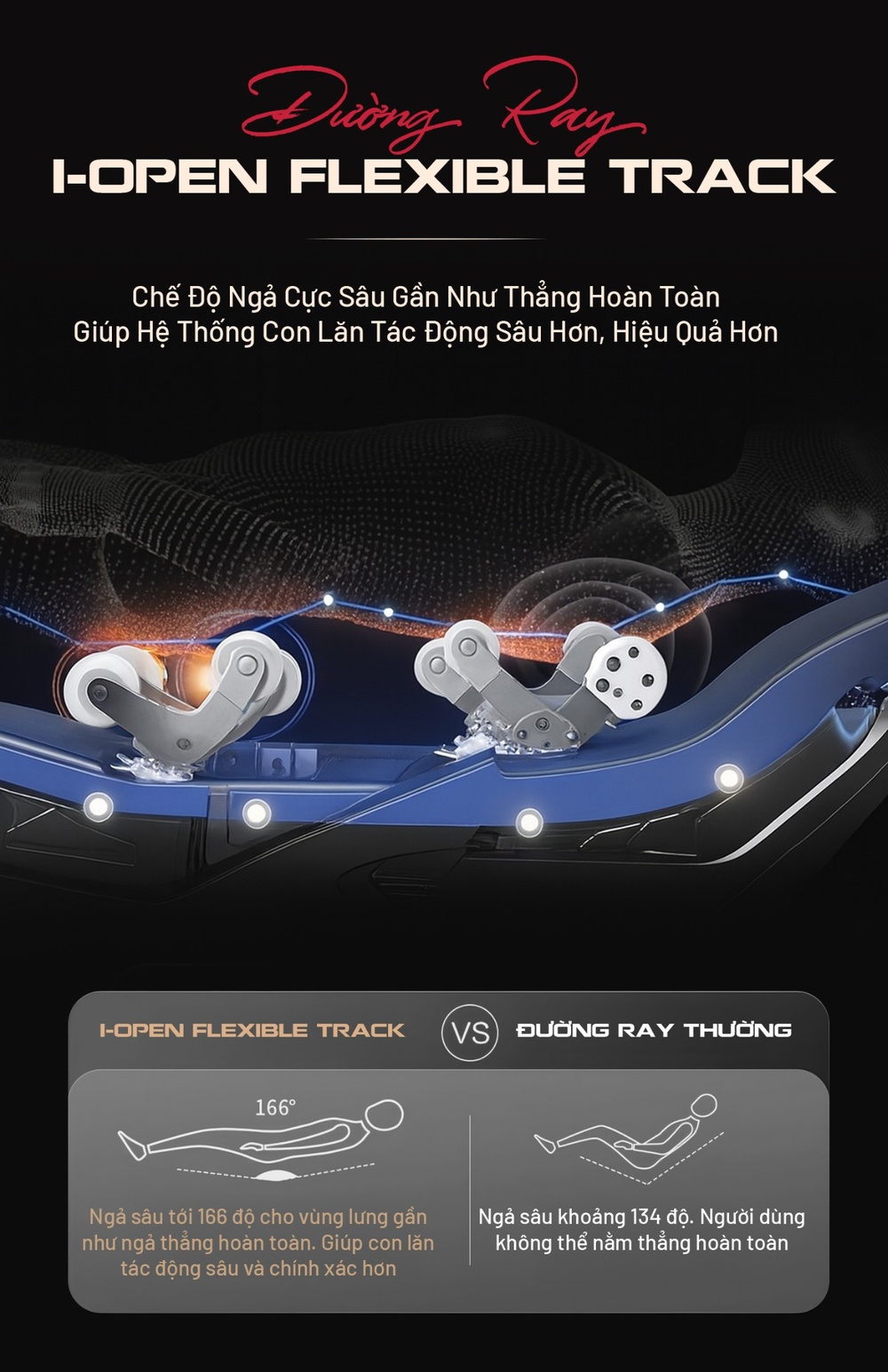 Đường ray I-OPEN flexible track mang đến trải nghiệm massage vượt trội với khả năng ngả sâu đến 166 độ, cho vùng lưng gần như ngả thẳng hoàn toàn. Thiết kế độc đáo này còn giúp con lăn tác động sâu hơn vào các vị trí huyệt đạo quan trọng mà ở những mẫu ghế massage thông thường khó có thể tiếp cận.