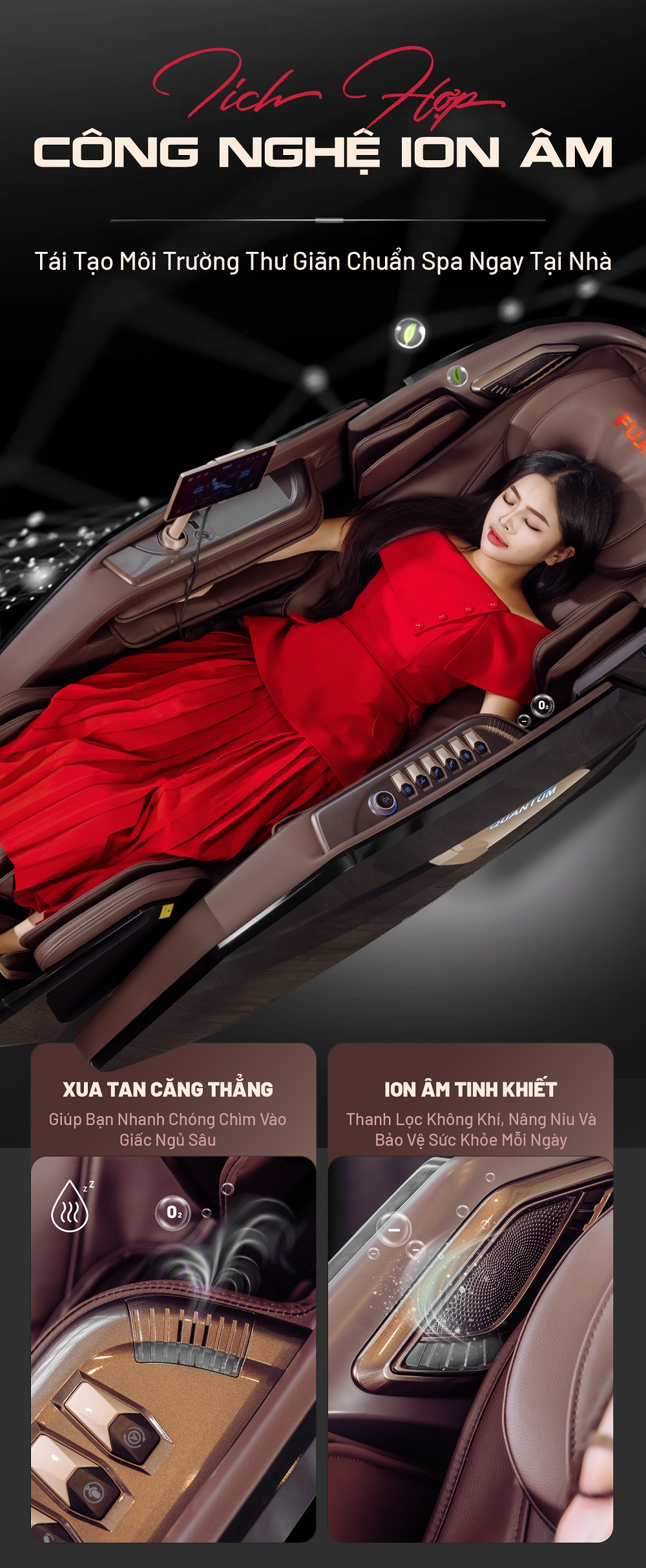 Ghế massage Fuji Quantum được tích hợp công nghệ ion âm lọc không khí hiện đại, giúp loại bỏ bụi mịn và vi khuẩn, mang lại bầu không gian trong lành, thoáng đãng. Trong quá trình thư giãn, cơ thể không chỉ được chăm sóc toàn diện mà còn hít thở nguồn khí sạch, hỗ trợ tăng cường sức khỏe. Đây chính là sự kết hợp hoàn hảo giữa trị liệu massage và chăm sóc môi trường sống.