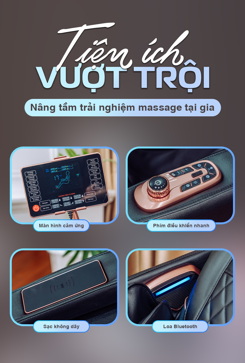 Không chỉ sở hữu những tính năng massage vượt trội, Fuji V6 còn được trang bị loạt tiện ích thông minh: điều khiển giọng nói, màn hình cảm ứng nhạy bén, phím điều khiển nhanh tiện lợi, sạc không dây và loa Bluetooth. Tất cả được tối ưu để mang đến sự thoải mái, tiện nghi và thư giãn trọn vẹn.