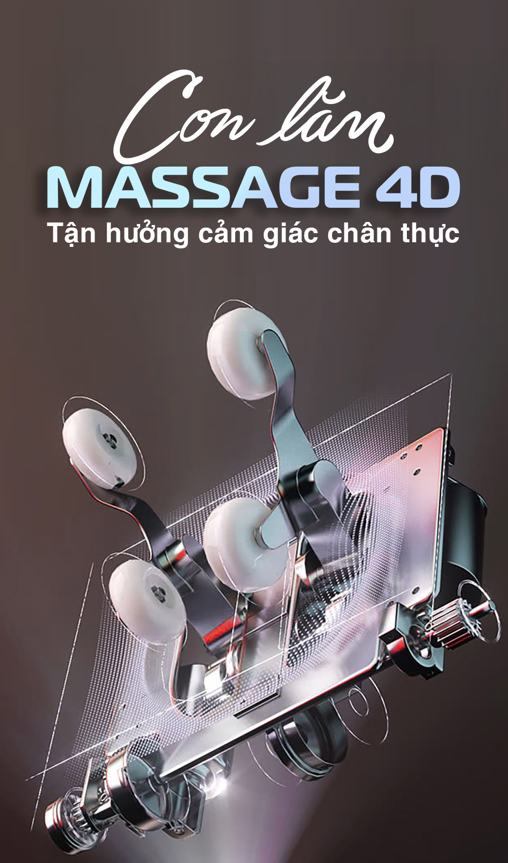 Công nghệ massage 4D mô phỏng một cách chính xác các động tác massage chuyên nghiệp như vỗ, ấn, nhào, nặn, miết, day huyệt,... tác động sâu vào từng thớ cơ, đánh tan mệt mỏi, đau nhức. Bạn sẽ có cảm giác như đang được chăm sóc bởi những chuyên viên massage giàu kinh nghiệm ngay tại chính ngôi nhà của mình.