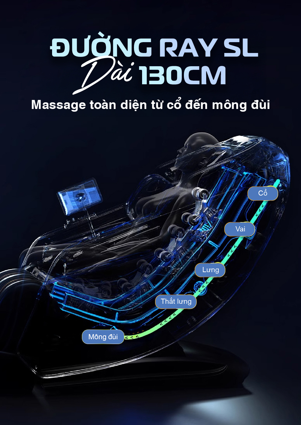Không chỉ dừng lại ở vùng lưng như những chiếc ghế massage thông thường, Fuji V6 sở hữu đường ray SL siêu dài 130cm, ôm trọn cơ thể từ cổ đến tận mông đùi, giúp mở rộng phạm vi massage, tác động sâu vào từng huyệt đạo quan trọng. Đường ray SL được thiết kế uốn lượn theo đường cong tự nhiên của cơ thể, kết hợp cùng hệ thống con lăn di chuyển linh hoạt, êm ái, mang đến cho bạn cảm giác thư giãn, thoải mái tối đa, xua tan mọi căng thẳng, mệt mỏi.