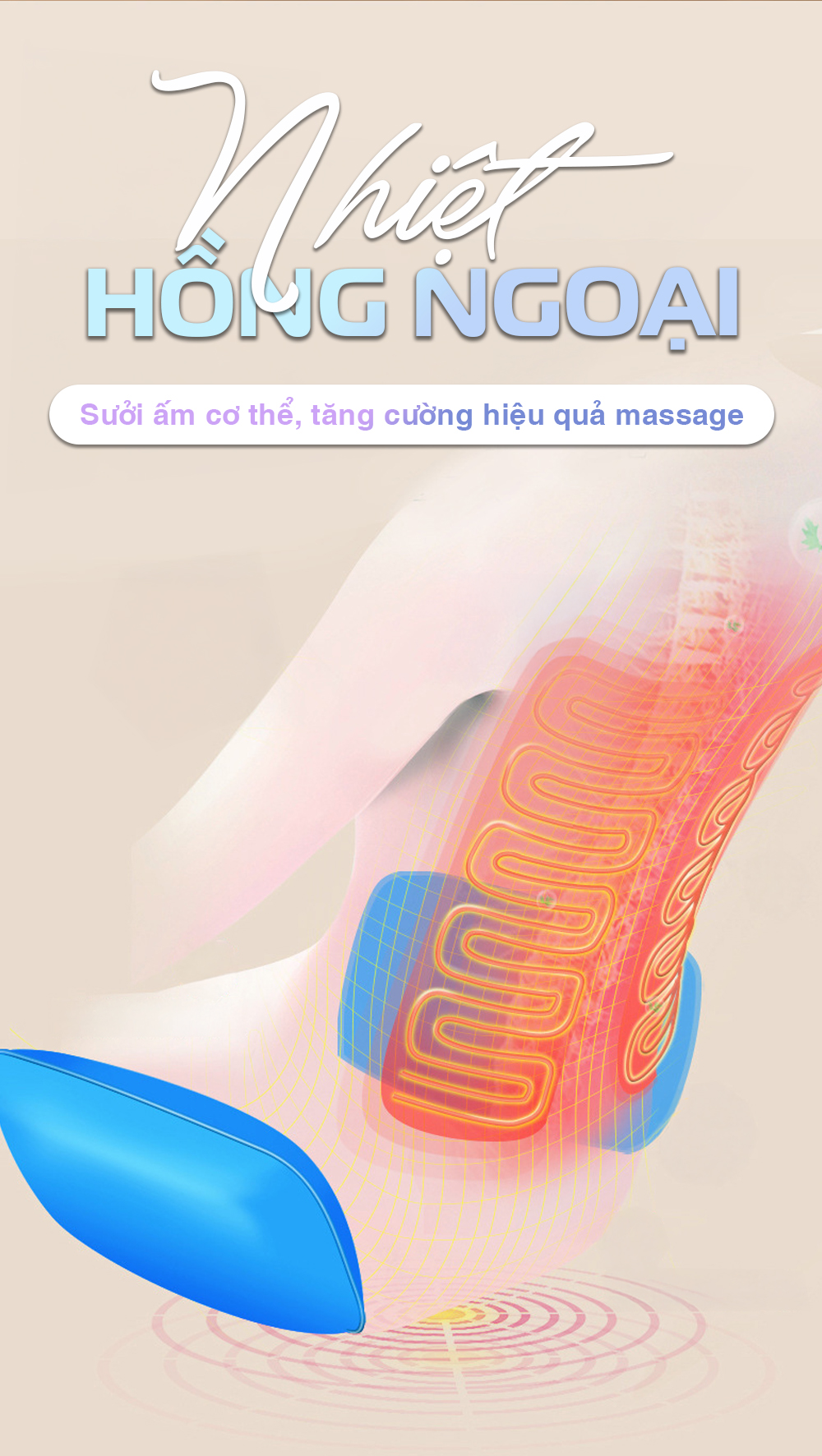 Kết hợp với các bài massage, chế độ nhiệt hồng ngoại nhẹ nhàng tỏa nhiệt ấm áp tại vùng lưng, giúp sưởi ấm cơ thể, làm giãn nở mạch máu, tăng cường tuần hoàn máu. Nhiệt hồng ngoại còn giúp giảm đau nhức, thư giãn cơ bắp hiệu quả hơn.