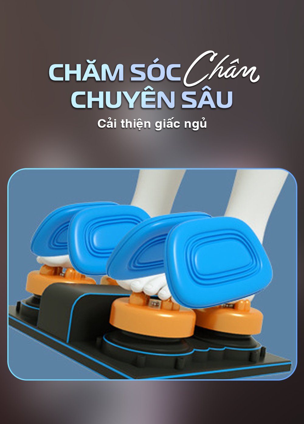 Đôi bàn chân được ví như "trái tim thứ hai" của cơ thể, mang trọng lượng của cả cơ thể. Hiểu được điều đó, Fuji V6 đặc biệt chú trọng đến việc chăm sóc đôi bàn chân với chế độ massage chân chuyên sâu. Ghế được trang bị con lăn và túi khí chuyên dụng tại vùng bắp chân và lòng bàn chân. Các con lăn mô phỏng các động tác day, ấn huyệt đạo, kết hợp túi khí co bóp nhịp nhàng, giúp giảm đau mỏi, thư giãn cơ, cải thiện tuần hoàn máu, cho đôi chân luôn khỏe mạnh, tràn đầy năng lượng.