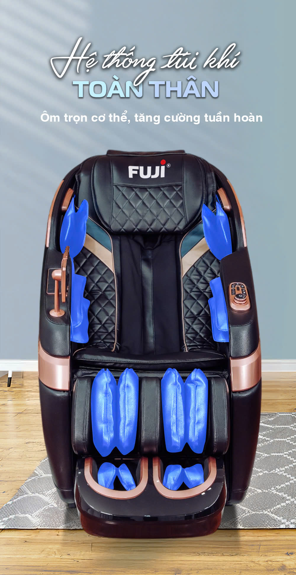 Không chỉ có con lăn, Fuji V6 còn được trang bị hệ thống túi khí toàn thân được bố trí khoa học tại các vùng vai, tay, hông, bắp chân, bàn chân. Các túi khí này hoạt động theo cơ chế bơm - xả khí nén nhịp nhàng, mô phỏng các động tác bóp, ấn, nhẹ nhàng tác động vào các cơ, huyệt đạo, giúp tăng cường lưu thông máu, giảm tình trạng tê bì chân tay, mang lại cảm giác thư giãn, sảng khoái.