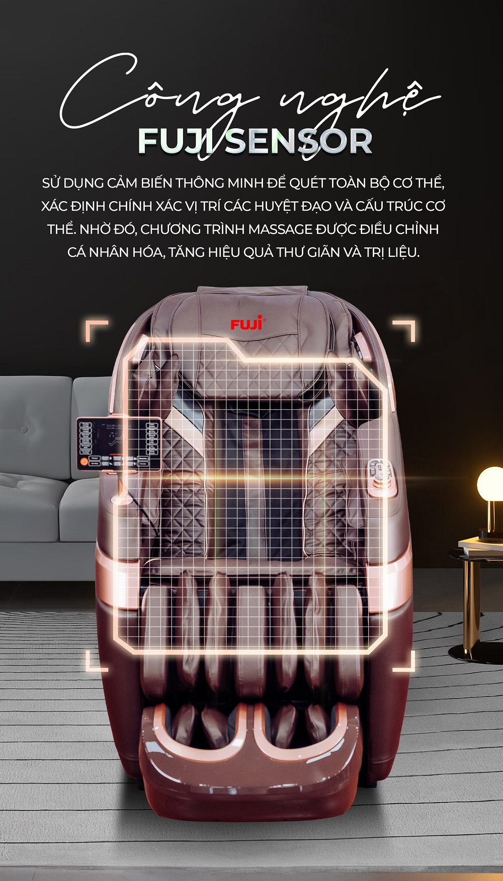 1.4. Công Nghệ Cảm biến Fuji Sensor: Công Nghệ Cảm biến Fuji Sensor là một trong những tính năng thông minh và tiên tiến nhất trên các dòng ghế massage toàn thân hiện đại. Nó đóng vai trò như một "mắt thần" của ghế, cho phép thiết bị tự động nhận diện và phân tích cấu trúc cơ thể của từng người dùng một cách chính xác trước khi bắt đầu liệu trình massage. Cụ thể, ngay khi bạn ngồi vào ghế, hệ thống cảm biến quang học hoặc cảm biến áp lực tích hợp sẵn sẽ nhanh chóng quét và thu thập dữ liệu về chiều cao, đường cong cột sống, vị trí các vùng cơ bắp quan trọng và huyệt đạo trên cơ thể bạn. Dữ liệu này sau đó được bộ vi xử lý của ghế phân tích để lập một bản đồ cơ thể 3D cá nhân hóa. Dựa trên bản đồ này, các con lăn massage sẽ tự động điều chỉnh vị trí xuất phát, phạm vi di chuyển, và lực tác động sao cho hoàn toàn phù hợp với vóc dáng và nhu cầu riêng của bạn.