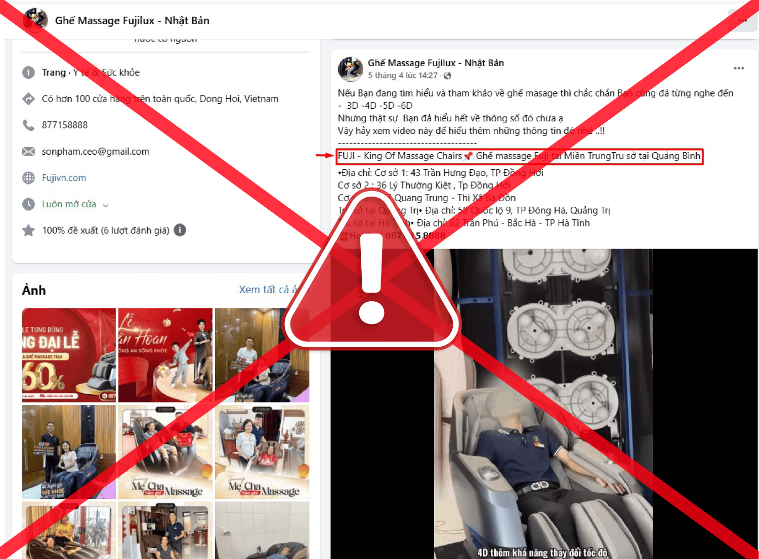 Vạch trần hành vi lừa đảo: Gần đây, chúng tôi phát hiện tài khoản Facebook mang tên "Ghế Massage Fujilux - Nhật Bản" đang thực hiện hành vi xâm phạm trắng trợn quyền sở hữu trí tuệ của thương hiệu Fuji. Cụ thể, trang này đã bất chấp luật pháp, ngang nhiên sử dụng trái phép tên thương hiệu "Fuji" trong các bài đăng, video quảng cáo ghế massage nhằm mục đích lừa dối người tiêu dùng rằng họ là đại lý chính thức, nhà phân phối được ủy quyền hoặc sản phẩm của họ có liên quan đến thương hiệu Fuji. Đây là hành vi cố ý gây nhầm lẫn, không chỉ làm ảnh hưởng đến uy tín của Fuji, mà còn đầu độc thị trường, gây ra sự nhầm lẫn nghiêm trọng cho khách hàng.
