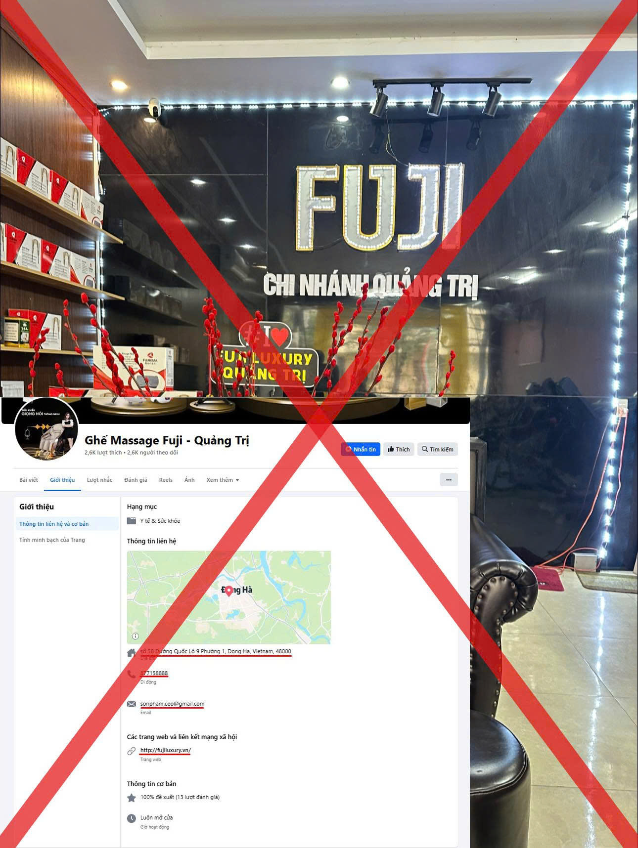 Ngoài ra, trong bối cảnh thị trường cạnh tranh gay gắt, việc một số cá nhân và tổ chức lợi dụng uy tín của các thương hiệu lớn để trục lợi đang ngày càng trở nên phổ biến. Gần đây, một đơn vị tại địa chỉ số 58, Quốc lộ 9, TP. Đông Hà, Quảng Trị đã ngang nhiên lập fanpage "Ghế Massage Fuji - Quảng Trị" nhằm lừa dối người tiêu dùng. Hành vi giả mạo trắng trợn này không chỉ gây thiệt hại cho thương hiệu mà còn tiềm ẩn rủi ro cho khách hàng khi mua phải sản phẩm kém chất lượng. Vì vậy, người tiêu dùng cần hết sức cẩn trọng và chỉ nên mua sắm tại các kênh phân phối chính thức của Fuji.